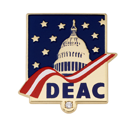 The Capitol Building and a single stone set diamond are the highlights of this custom membership lapel pin for DEAC. High polished gold with red, white and blue color-fill inspire patriotic thoughts and feelings.