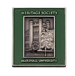 A stunning modeled campus building is the image portrayed on this unique custom antique silver and green color-filled lapel pin. Marshall University recognizes donor support with membership into the Heritage Society by awarding this beautiful pin with just a hint of red color-fill.