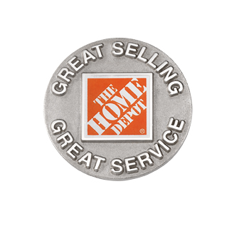 The iconic Home Depot logo is at the center of this custom silver sandblast and polished lapel pin highlighting Great Selling and Great Service by deserving team members.