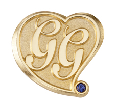 The Mary Kay double G's for Go Give are surrounded by a heart and a stone set blue sapphire. Consultants strive to earn this coveted custom gold sandblast and polished lapel pin award.