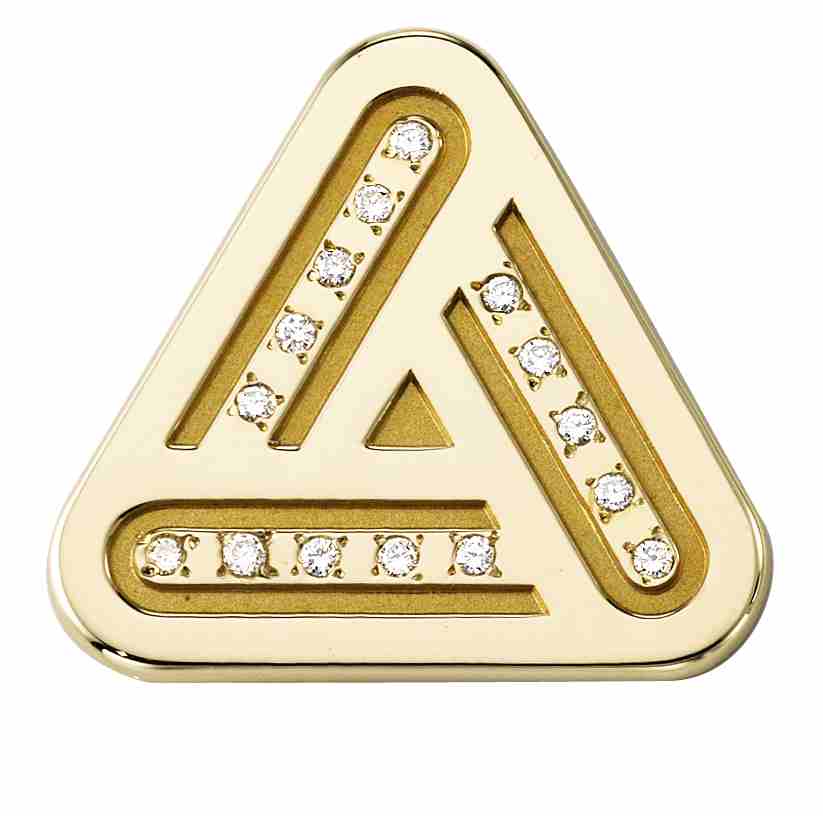 Diamonds line the three parts of the Avery Dennison triangle logo on this custom gold sandblast and polished lapel pin.  Awarded to only the highest sales staff, it is a coveted recognition award.