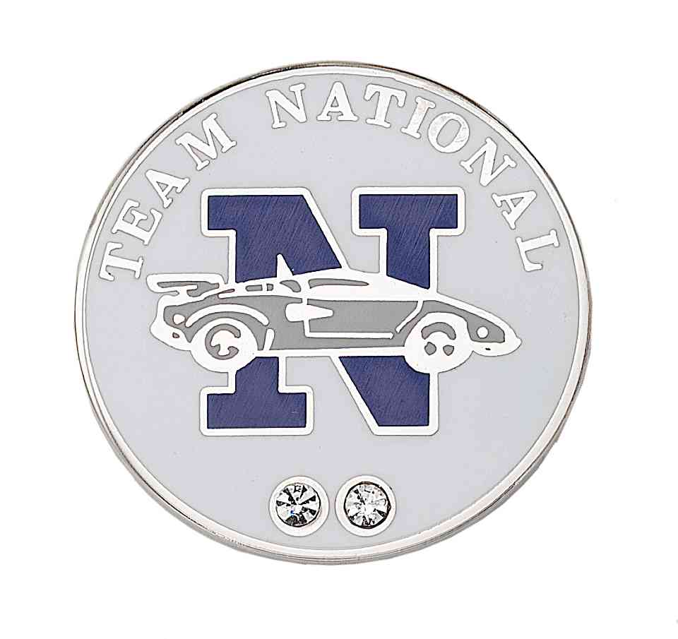 The image of a car races across a varsity letter "N" on this sporty custom lapel pin. Two symbolic diamonds are set at the bottom.