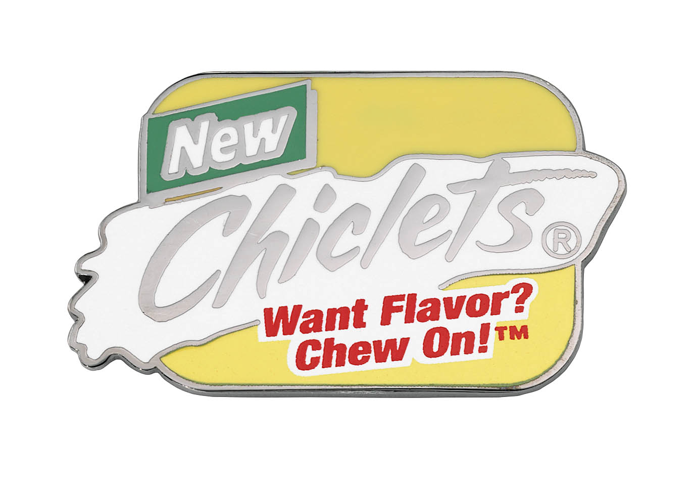 Chiclets decided to promote their new product with this colorful custom lapel pin. Their logo spills off the rectangular frame, and their tagline is included below.