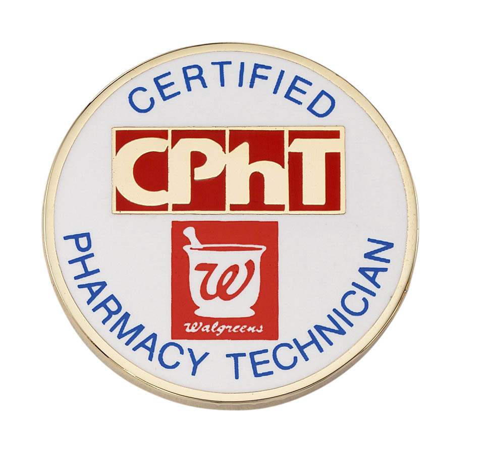 This custom pin welcomes its recipient to the ranks of Certified Pharmacy Technician with Walgreens. It is a badge of honor and achievement, and signals to customers the high quality of their pharmacy staff.