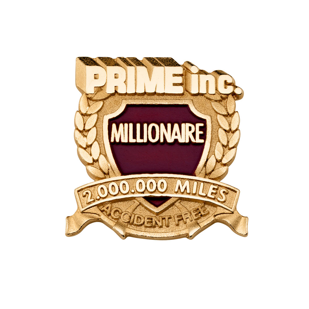 This custom safe driver award pin has many celebratory details. The Prime Inc. logo shines at the top of a laurel wreath, just above a colored crest declaring the recipient a "millionaire." A rippled banner announces the driver's accomplishment of driving two million miles without a single accident.