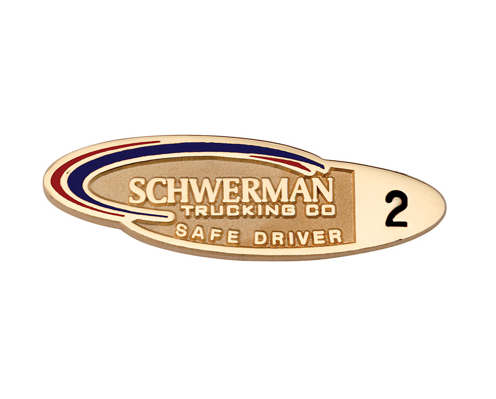 The Schwerman Trucking Company awarded their drivers for their years of safe driving with this elegant pin. Company colors sweep around one side, while the other prominently displays the recipient's years of safe driving.