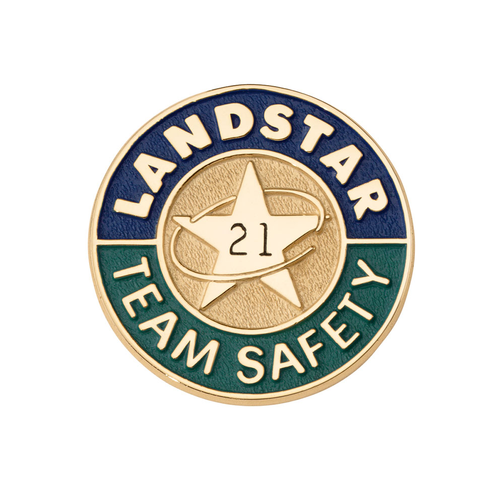 Landstar System Transportation awarded its drivers with this appealing safety award pin. Company colors encircle their logo, and an engraved number shows how many years the recipient has been a safe driver.