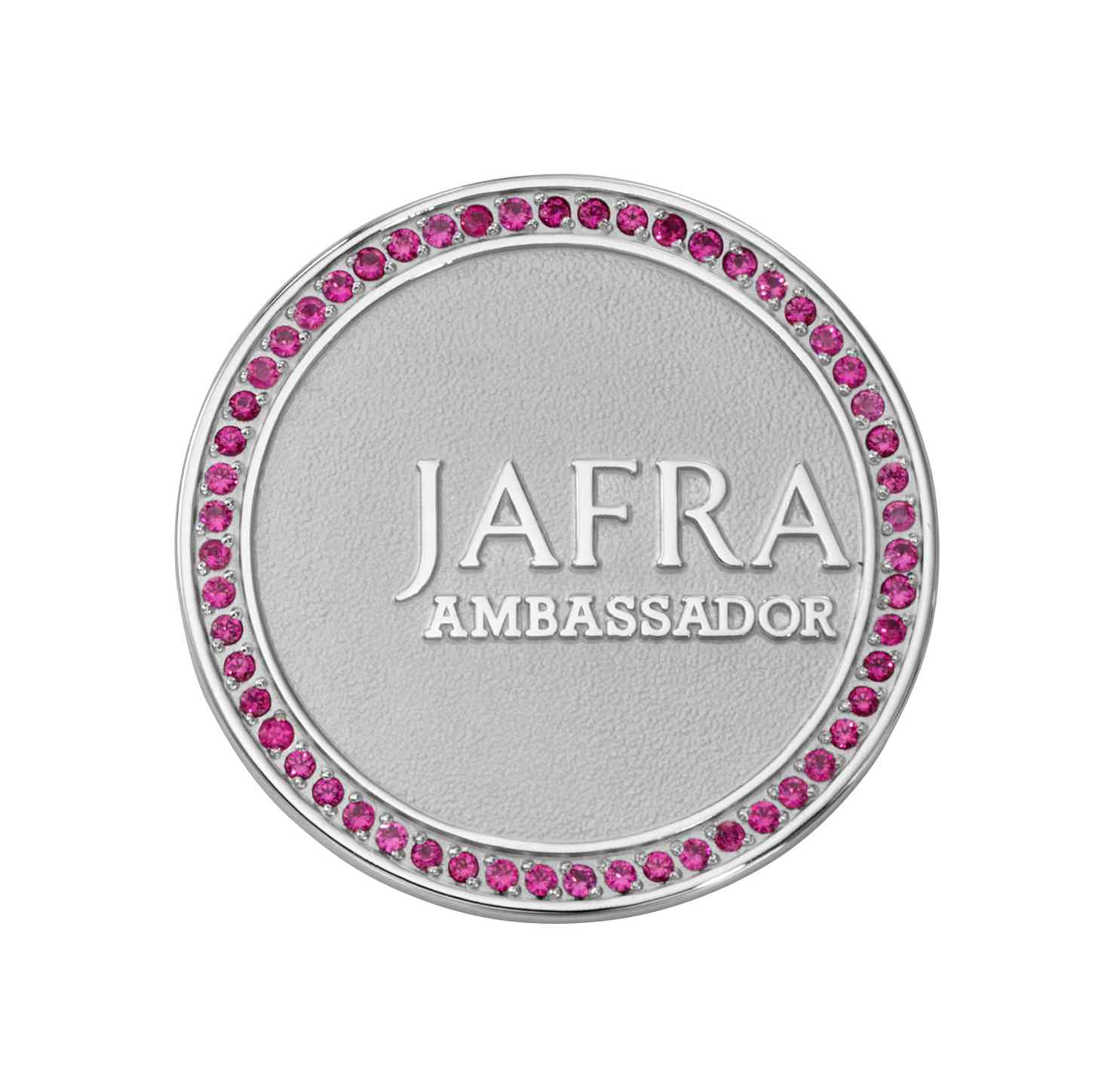 Jafra Cosmetics ambassadors were given these striking custom lapel pins to wear while out in the field. Small rubies create a glittering circular frame around an off-center logo.