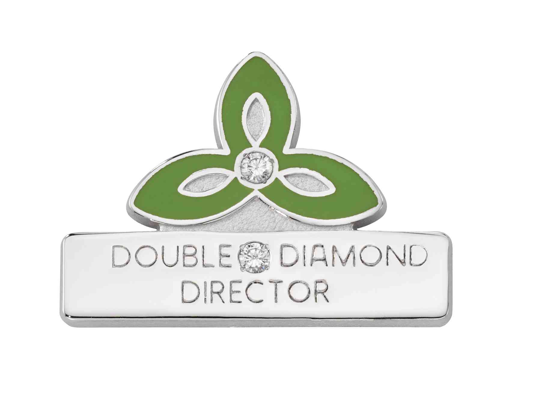 This custom performance award pin features diamonds integrated into the logo and text. Green color-fill is used to make the logo pop and the honor is displayed on the banner below.