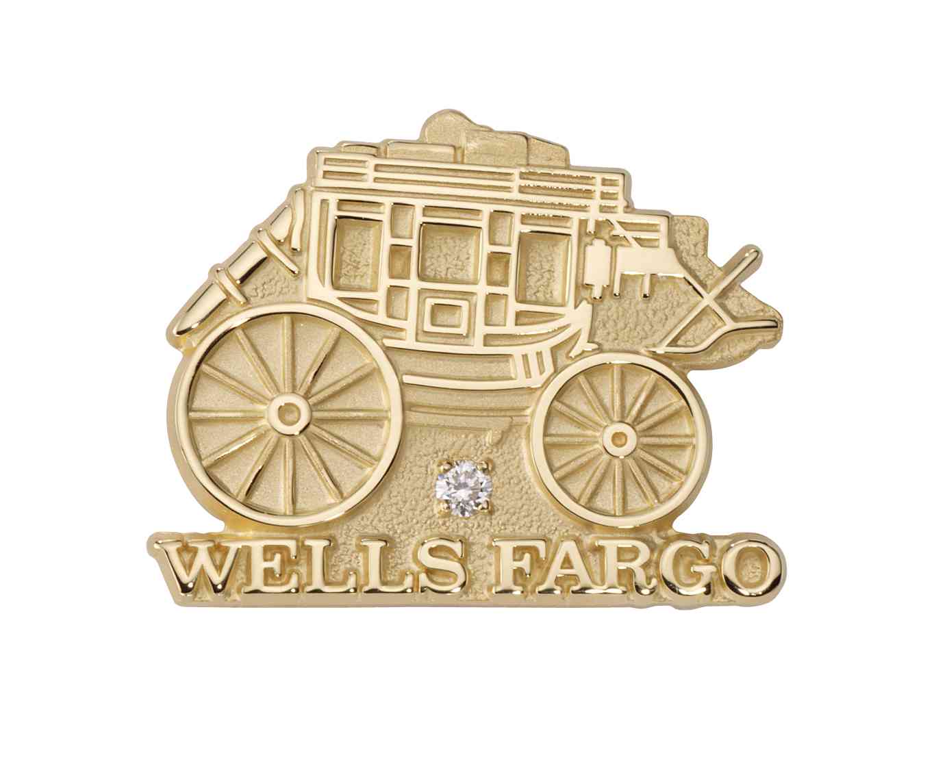 The Wells Fargo stagecoach logo is accented with a diamond on this custom retirement award pin.