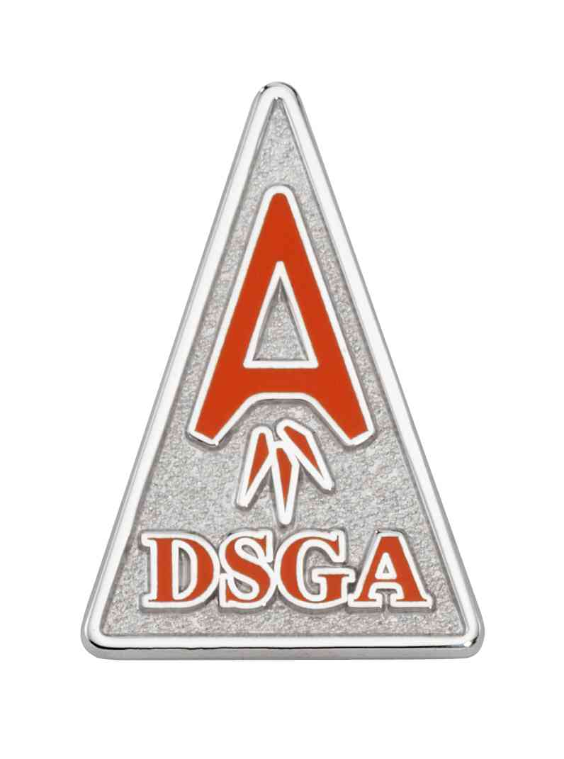 The DSGA gave these custom logoed lapel pins to their members to wear with pride. The shape of the pin mimics their logo and orange color-fill is used to display their association color.