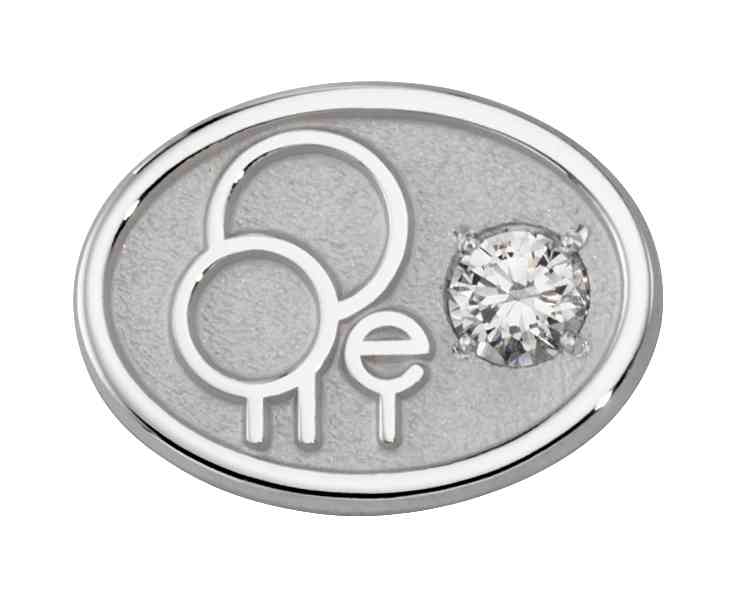 This length of service pin features a polished company logo contrasting against a more textured background. The diamond represents the number of years the recipient has worked for them.