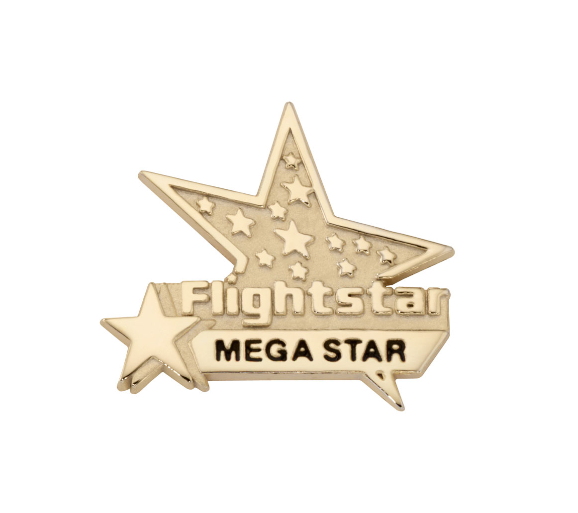 Flightstar thanked its employees for meeting performance goals with a series of custom award lapel pins. Their star-filled logo bursts out from the text, and black color-fill is used to make the achievement level stand out.
