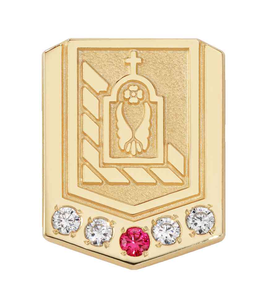 This length of service pin features the school logo with symbolic stones below. The diamonds and ruby tie in school colors while representing the number of years the recipient has worked for the school.