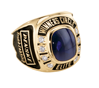 Diamonds elevate this classic men's gold award ring by framing a sapphire center stone. Gold lettering stands out against a black background and the Penske logo is proudly displayed on the side.