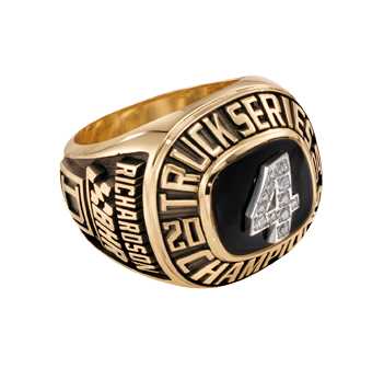 A stunning diamond encrusted sterling silver #4 is fastened to a black onyx center stone in this men's gold championship ring for Bobby Hamilton Racing, Their logo is proudly displayed on the side along with the recipient's name.