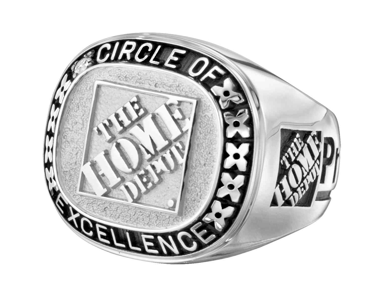 This Home Depot performance award ring welcomes its recipients into the "Circle of Excellence." As more goals are met, diamonds are added in each flower along the border. This Sterling silver ring also features the Home Depot logo on both the bezel and side.
