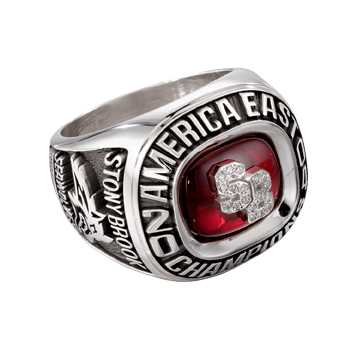 Diamond encrusted silver letters fastened to a ruby center stone add some dazzle to this traditional sterling silver men's championship ring. The school name is proudly displayed on the side along with their sea wolves mascot.