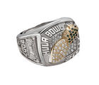 A diamond and emerald encrusted gold pineapple is the focus of this unique sterling silver men's championship ring. The Hula Bowl logo is featured on the side as well as the year.