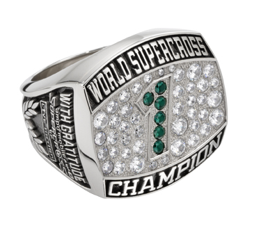 Multi-sized diamonds create a dazzling display around a emerald #1 in this 10 karat white gold men's championship ring. The Side of the ring features the Supercross logo along with sponsor logos and a laurel leaf.