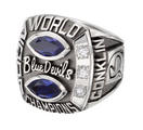 Two sapphires convey the team colors of the Blue Devils Drum Corps. in this stunning silver men's championship ring. Three diamonds draw your attention to the side bearing the recipient's name and the Blue Devils logo.