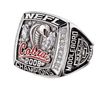 A sterling silver cobra is surrounded by diamond confetti in this spectacular men's championship ring for the Middleboro Cobras. The Cobras' name pops in red, and the NEFL logo is displayed on the side.