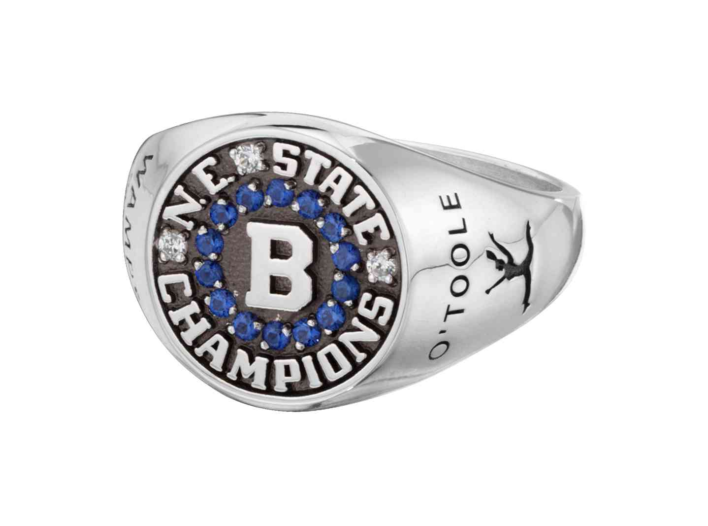 A varsity letter surrounded by a ring of sapphires creates a sense of team pride in this sterling silver women's championship signet ring. Diamonds separate the text, and custom engraving on the sides include the recipient's name and the team logo.