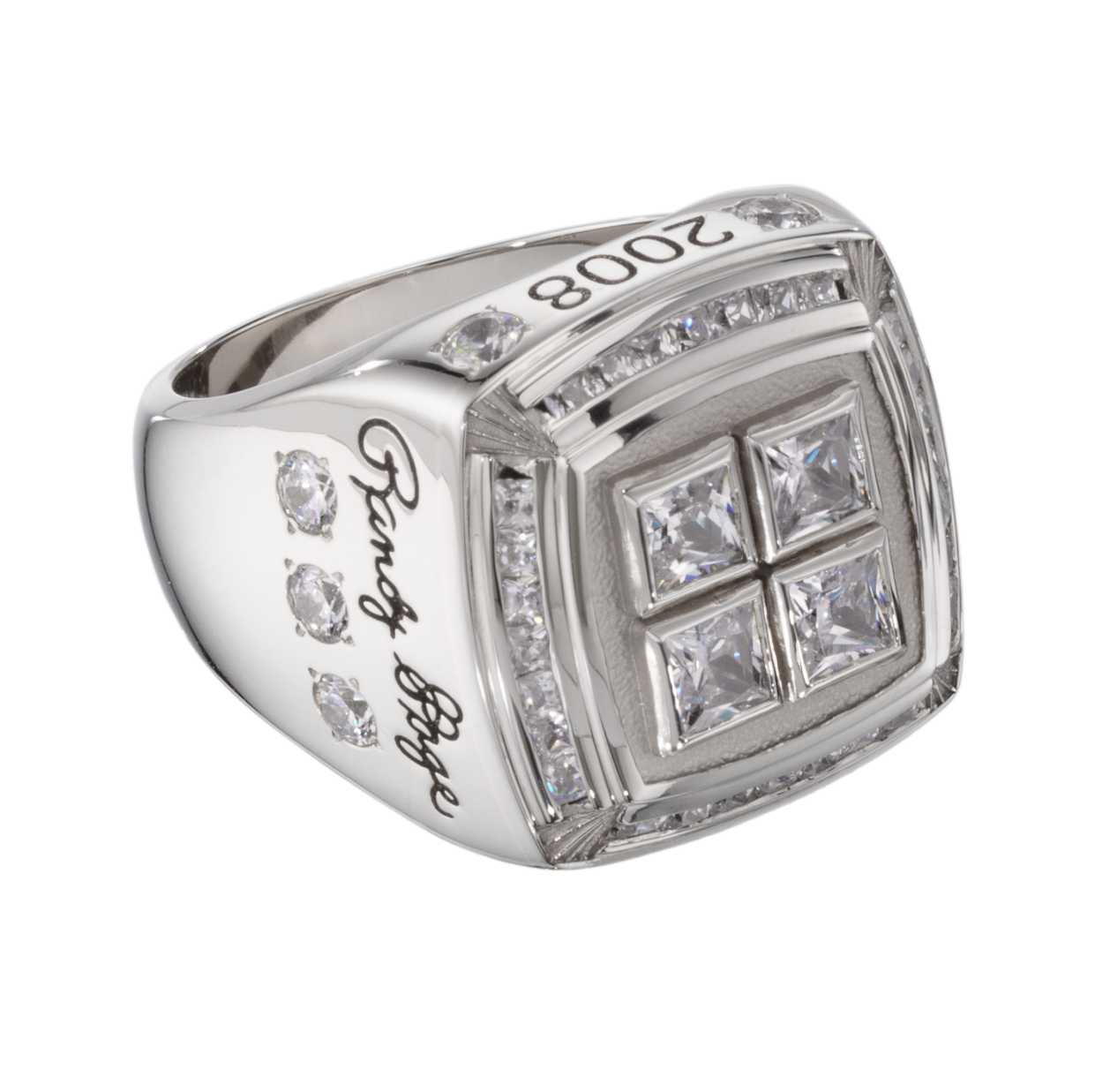 Diamonds stud every side of this beautiful 10 karat white gold men's award ring. The ring is also engraved with the year and company logo.