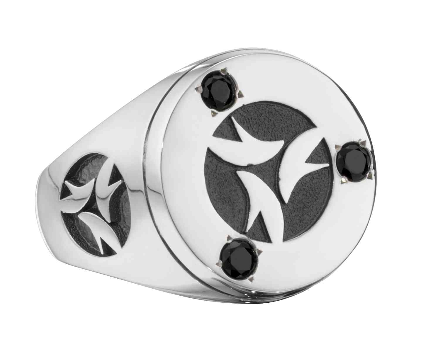 This simple sterling silver men's award signet ring features the company logo on the bezel and side. Three black onyx stones frame the top logo.