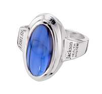 This 10 karat white gold women's award ring features a large oval sapphire center stone. Custom engravings on either side are colored black to contrast against the white gold and include the company name and achievement of retirement.