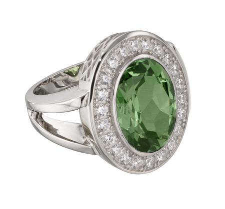 This dazzling 10 karat white gold women's award ring features a stunning round emerald surrounded by diamonds. Intricate woven detailing on the side of the bezel and a split-shank band add an air of refinement to this ring.