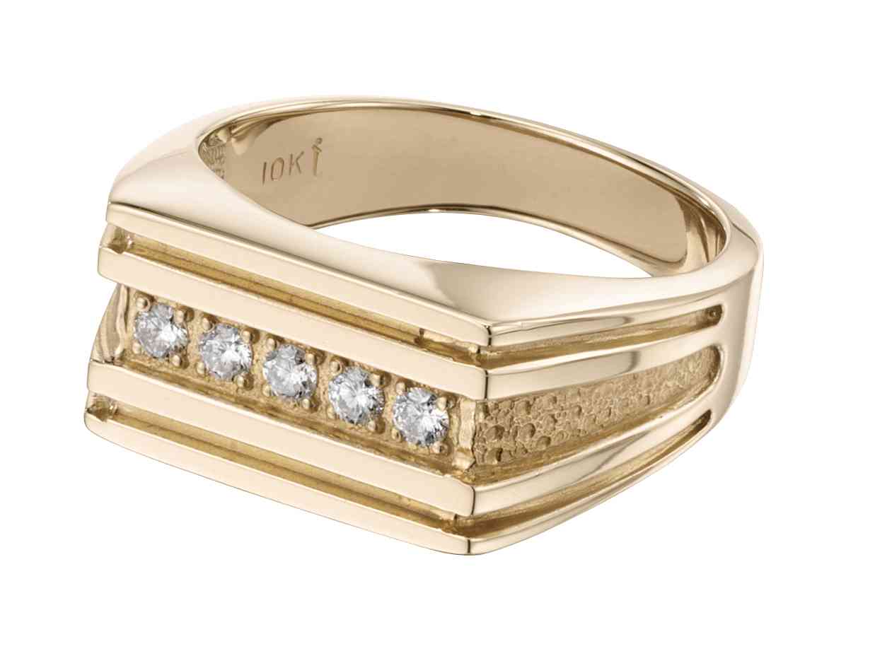 Beautiful gold detailing frames five diamonds in this contemporary 10 karat gold women's award ring.