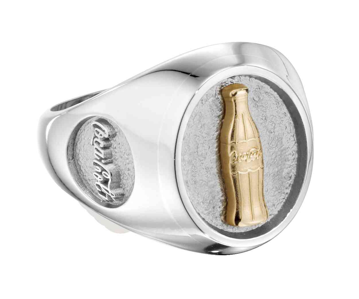 A 14 karat gold cola bottle stands out on this sterling silver men's signet award ring. The company logo is cast into the side of the ring.