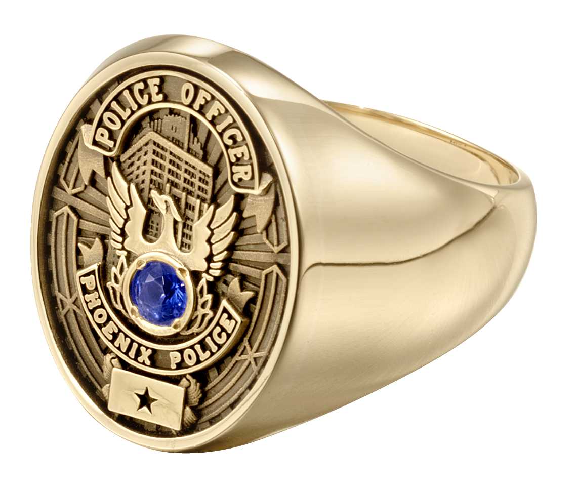 A round sapphire shines in the center of the Phoenix PD logo in this exquisitely detailed 10 karat gold public service signet award ring. A banner at the bottom is engraved with a symbolic star.