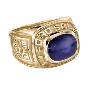 A sapphire center stone adds the company color to this classic 14 karat gold men's sales award ring. The company logo is cast into the side of the ring.