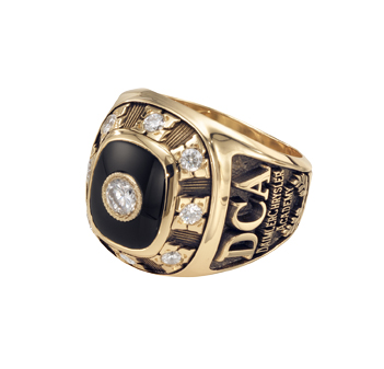 A beautiful round diamond is set inside a black onyx center stone in this classic 14 karat gold men's sales award ring. The center is framed by diamonds, and the association initials are cast into the side.