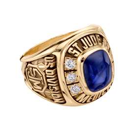 A gorgeous sapphire center stone is accented on either side by diamonds in this 14 karat gold men's sales award ring. The company name is displayed on the top, and their logo and division are cast into the side.