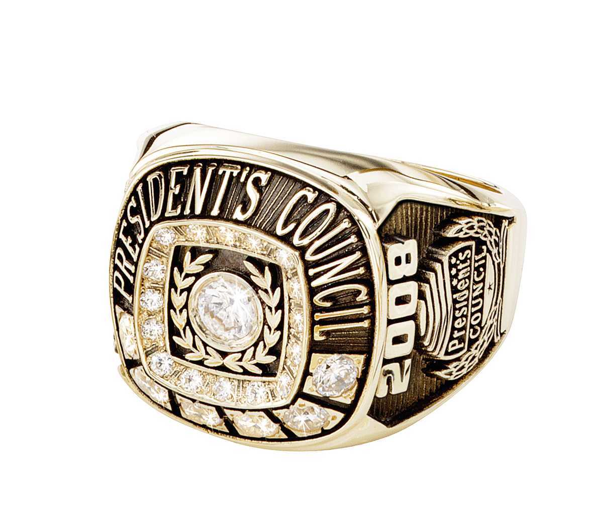 This dazzling 14 karat gold men's sales award ring features a round diamond framed by a laurel wreath and encircled with more diamonds. The side of the ring is customized with the year and a logo.