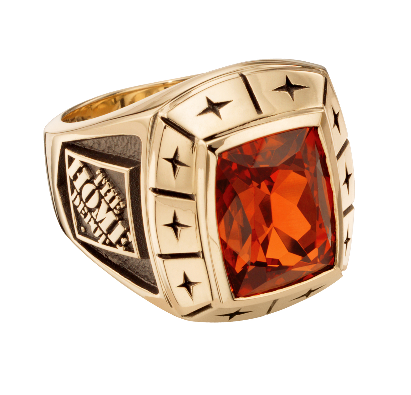 A glittering garnet stone is the focus of this 10 karat gold sales award ring. Each star around the center stone can have a diamond set inside as the employee achieves more goals. The company logo is proudly displayed on the side.