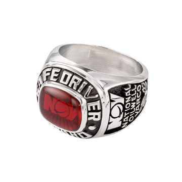 The company logo is etched into a ruby center stone in this sterling silver men's safe driver award ring. The company logo is featured again on the side.