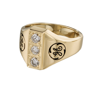 Three diamonds are set in a row in this sleek 14 karat gold women's award ring. The company's logo is engraved on either side and colored black.