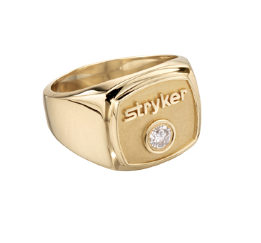 A round diamond in a well accompanies the Stryker logo atop this strikingly simplistic men's two-tone gold ring.
