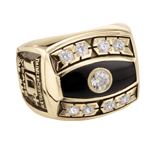 This spectacular ring features a diamond and black onyx center with more diamonds adorning the framing detail. The wide, rounded band adds an air of strength to this Daimler Chrysler sales award ring.