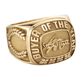 This collegiate style men's two-tone gold ring celebrates Stein Mart's buyer of the year. The logo is proudly featured in the center, while the achievement surrounds it in large lettering. A laurel wreath on the side adds prestige to this high award.