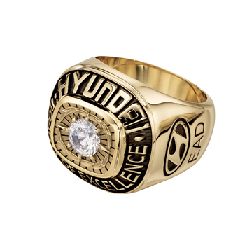 Intricate gold details add to the dazzle of a diamond center stone in this Hyundai men's award ring. The custom engraved logo with black color fill adds dimension and contrast against the gold.
