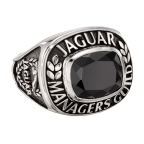 menThis classic men's sterling silver award ring features the brand and achievement, separated by laurels, surrounding a black onyx center stone. The Jaguar logo is proudly displayed over more celebratory laurels on the side