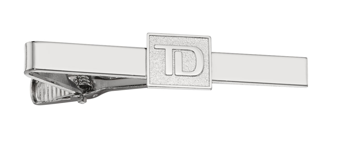 A custom silver sandblast and polished TD Bank logo emblem is adhered to a wider style silver tie bar. A great client gift.