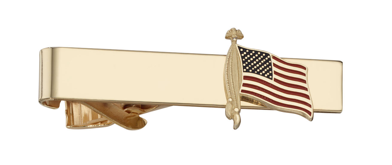 A custom American flag emblem is adhered to a wider style gold tie bar. A perfect way to show your love of the USA!