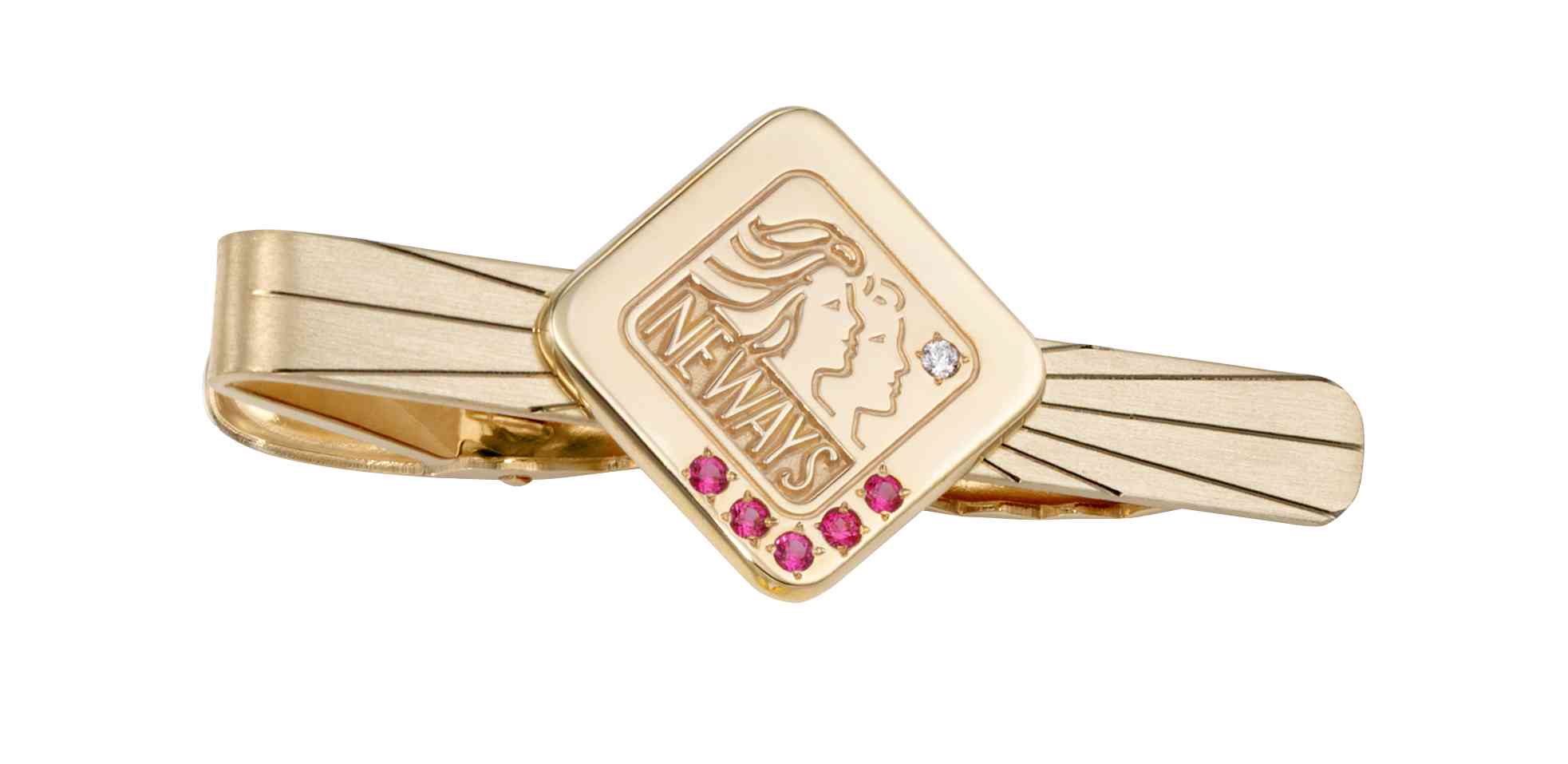 The Neways logo is recessed into this high polished gold emblem with diamonds and pink garnets on a bright cut gold tie bar. Different stone colors represent each career level attained.
