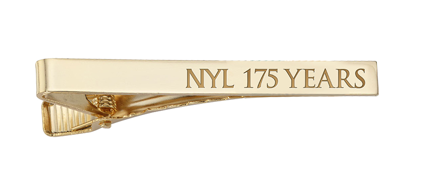 The New York Life NYL letters and anniversary yeasrs are laser etched on this thin style gold tie bar. A great milestone anniversary commemorative gift for board members or major clients.